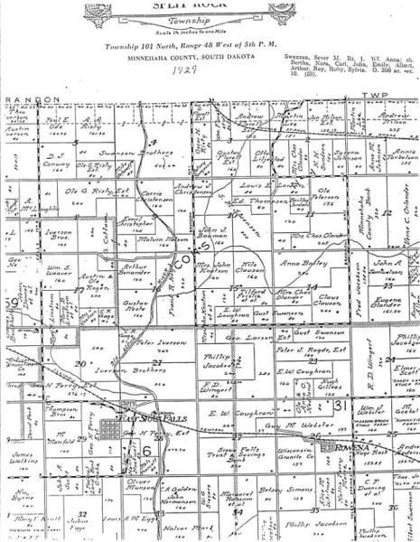 The Sievert Swenson plot of land consisted of an area that stretched south of the Splitrock Creek to Beaver Creek, this area is codified as #20 on the map; on the northern shores of the Splitrock Creek, you will find a plot of land owned by Andrew J. Christianson which borders the Sievert property; whereas the location of which Til Huset had his infamous "Huset Corner" which was a gas station, scrap yard, and service station at the point where U.S Hwy 16 forms a junction with S.D Hwy 11 - that plot of land was owned by Melvin Nelson (hard to read name) on the north side, and Fran Heys on the southside of the highway. Til Huset would have operated his business on this 'corner'.